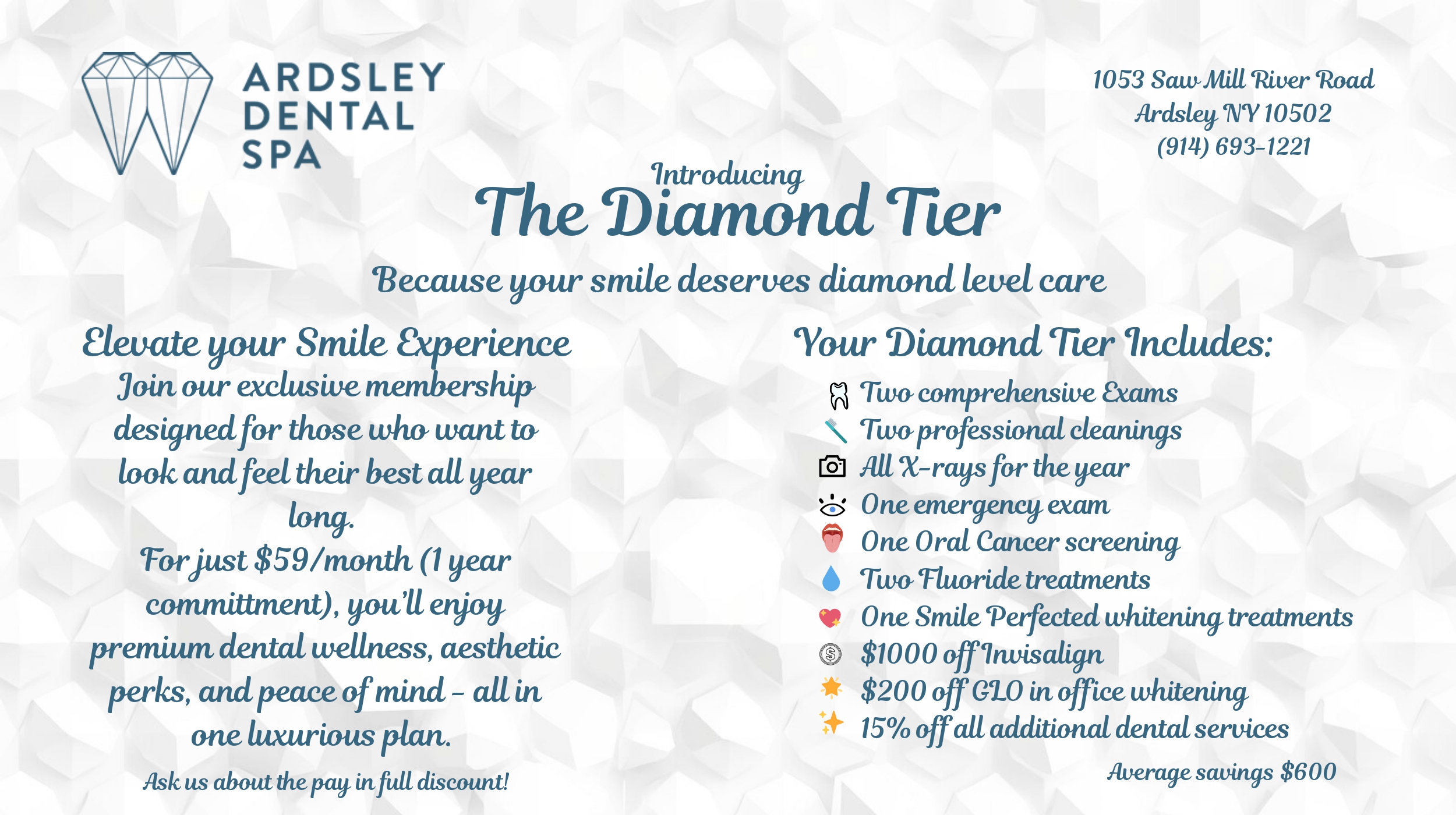 Join our exclusive Diamond Tier membership, designed for those who want to look and feel their best all year long. For just $59/month (with a 1-year commitment), you’ll enjoy premium dental wellness, aesthetic perks, and peace of mind — all in one luxurious plan.